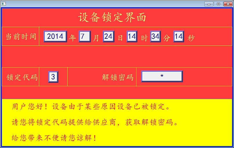 当设备系统时间达到设置速度的时间后,系统会自动跳转至解锁页面,用户需要根据锁定代码来向供应商索取解锁密码解锁,系统提供超级密码,以防忘记密码等意外情况!