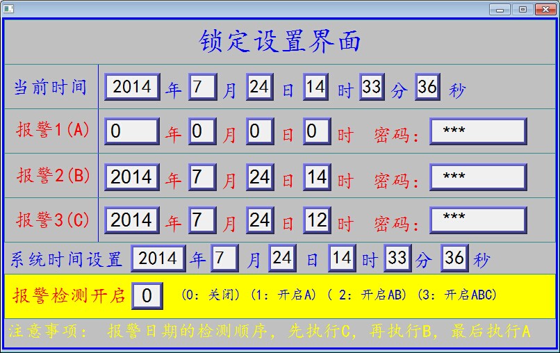 进入锁定设置界面,此界面提供3个锁定的时间段。可以设置不同的锁定时间,设置完成后检查参数无误后,输入需要锁定的代码;